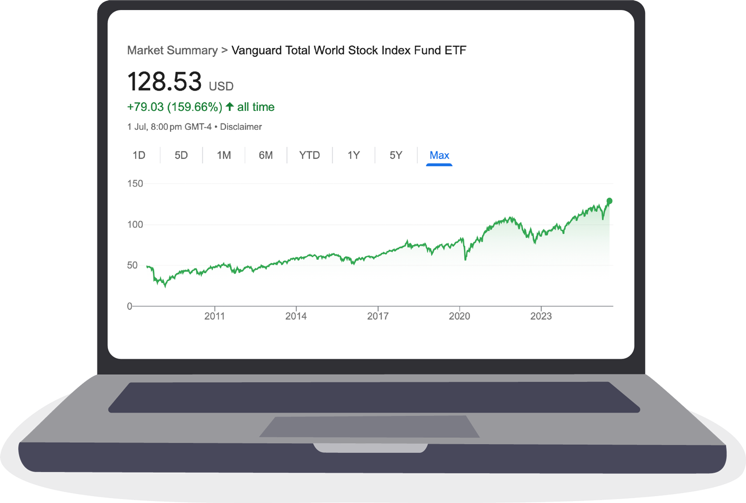 Total World ETF All Time Market Summary. Over time, the stock market tends to rise. (Source: Google)