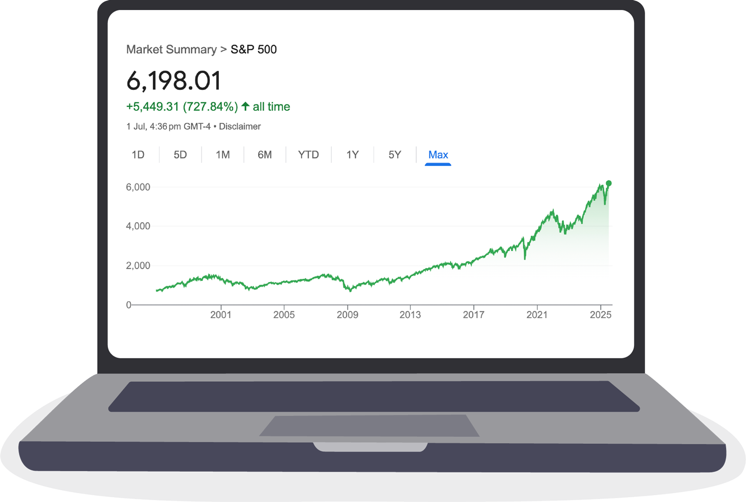 America: S&P 500. Over time, the stock market tends to rise. (Source: Google)